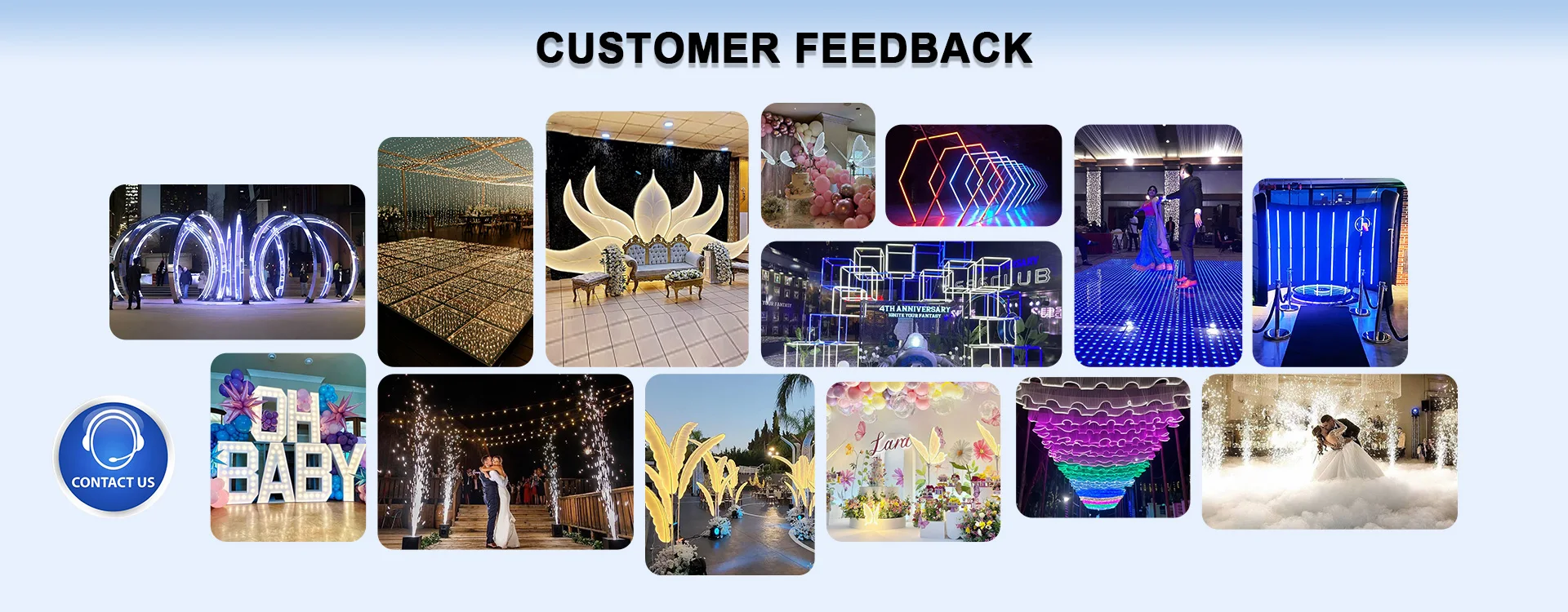 Productos principales:Cabina DE FOTOS 360, luz de escenario, escenario LED, números y letras, arco LED